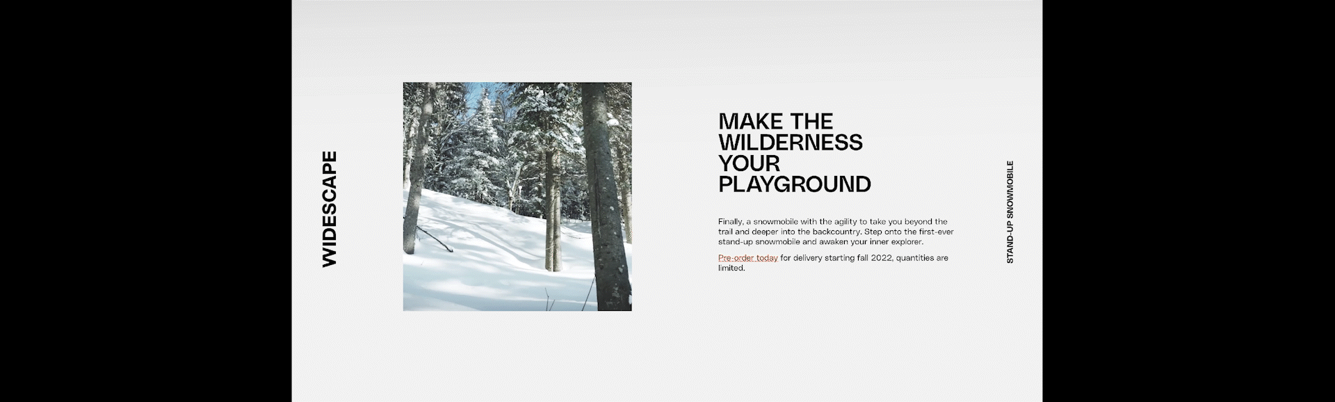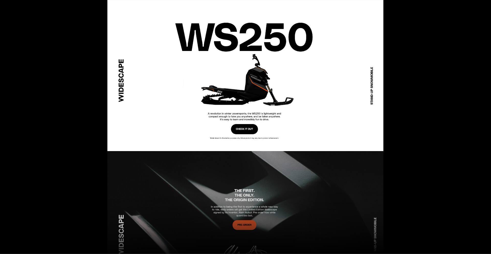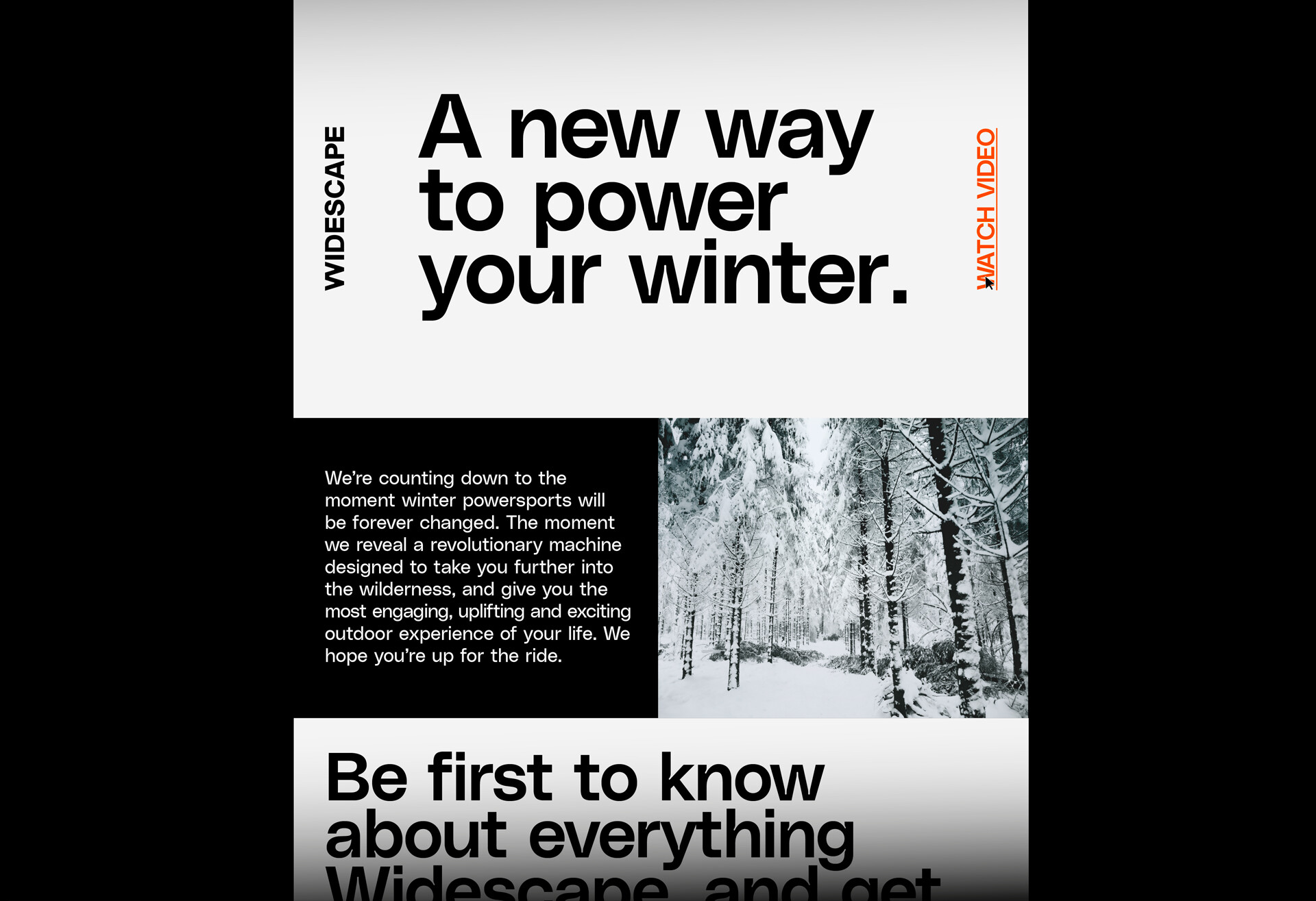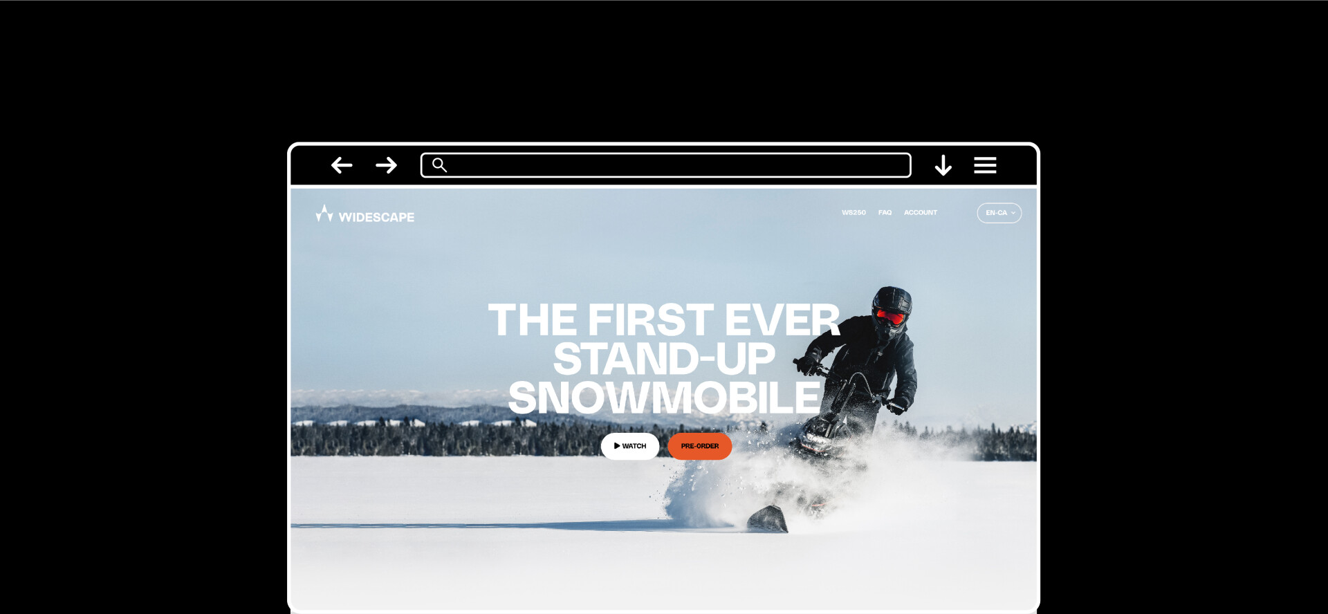 Widescape, the first ever stand-up snowmobile, offers more action and more emotion. Not just an all-new brand, it’s also a completely new category of product that will transform winter motorsports like never before.