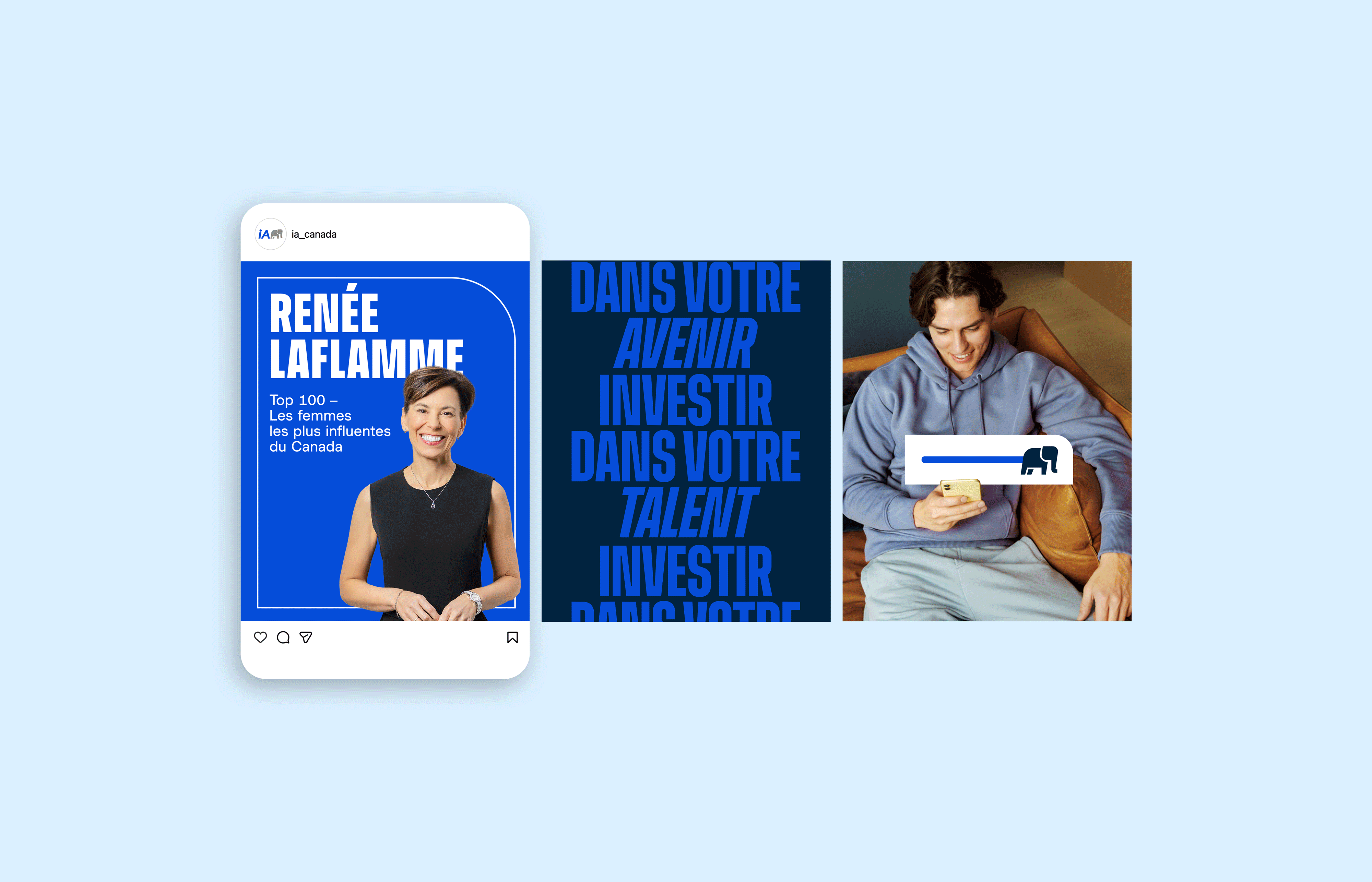En 130 ans, iA Groupe financier a évolué d’assureur québécois au rang de chef de file canadien en assurance vie et en gestion de patrimoine. En collaboration avec l’agence K72, le groupe dévoile une plateforme modernisée et une nouvelle signature de marque : Prendre les devants. Ce projet, déployé à l’échelle de l’organisation, définit une vision commune claire : iA est un allié de confiance, déterminé à aider ses client·es et ses conseiller·ères à atteindre leurs objectifs. Fidèle à son emblème, l’éléphant, iA conjugue solidité, bienveillance et ingéniosité pour garder une longueur d’avance dans un marché hautement concurrentiel. Aujourd’hui, le Groupe sert 11,6 millions de clients et amorce son expansion nord-américaine.